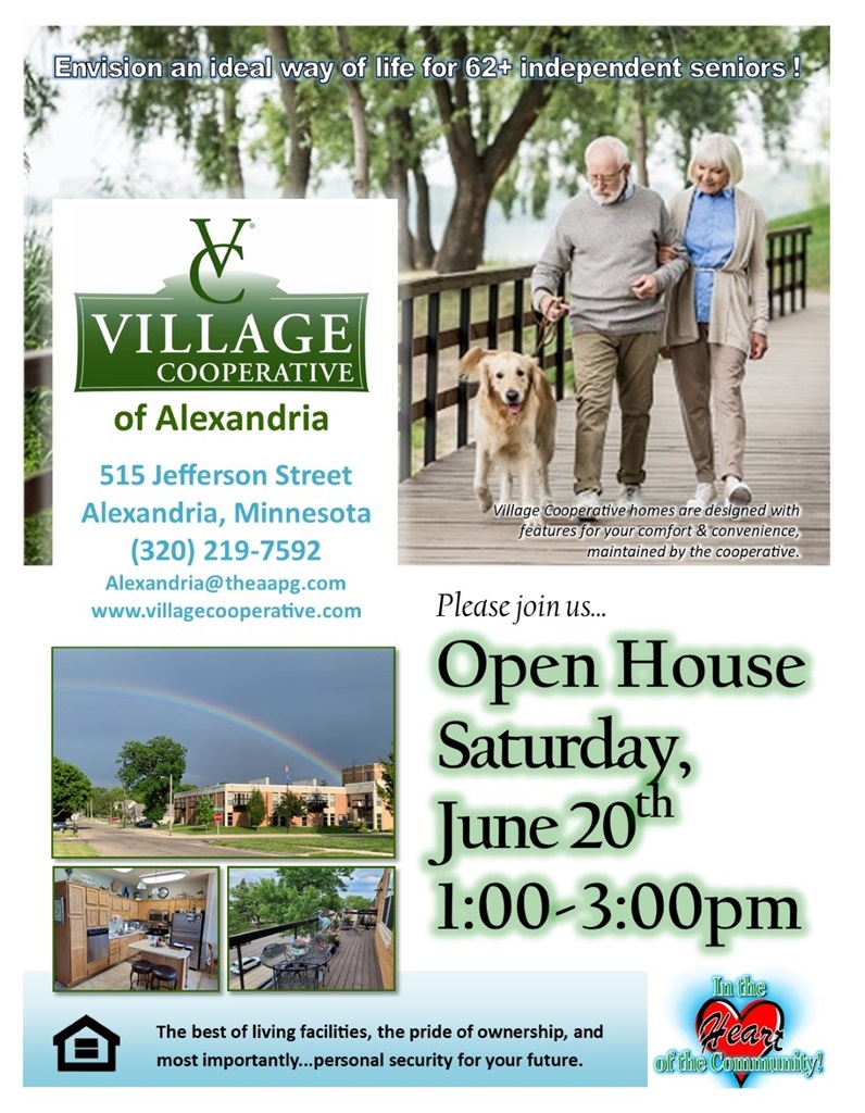 Jun 20 Village Coop Open House 1:00 pm - 3:00 pm Village Cooperative of Alexandria 515 Jefferson St., Ste. 209, Alexandria Event Details Get Directions