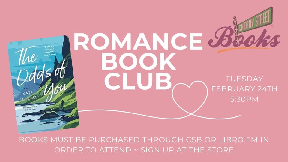 💞 Romance Book Club February Pick: The Odds of You by Kate Dramis 💞 📅 Date: Tuesday, February 24th 🕠 Time: 5:30pm-6:30pm 📍 Location: Cherry Street Books Books must be purchased through Cherry Street Books or Libro.fm to attend. Sign up in store to reserve your spot! Whether you’re a romance veteran or just dipping […] |