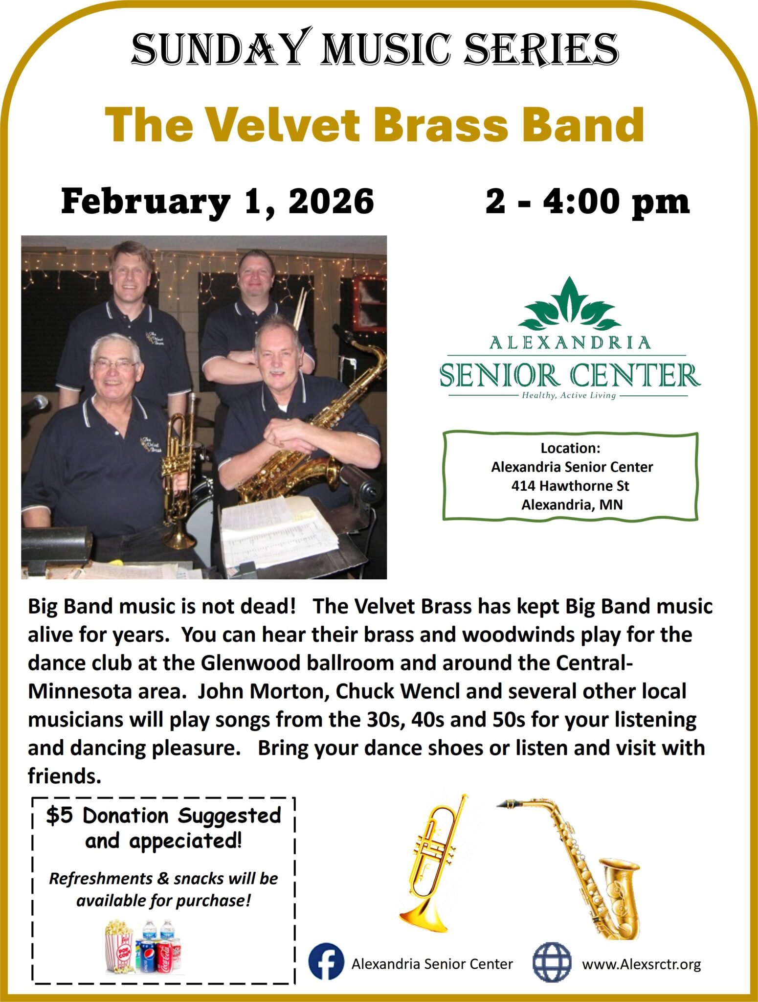 Sunday, February 1 from 2-4 join us at the Alexandria Senior Center, 414 Hawthorne for an entertaining afternoon. Come and listen to the sounds of 'Velvet Brass'. Velvet Brass has kept Big Band music alive for years. You can hear their brass and woodwinds play for the dance club at the Glenwood Ballroom and around […]