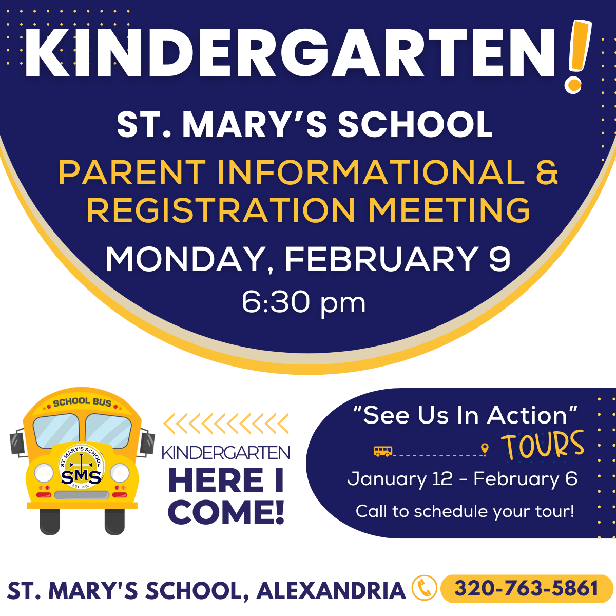 ⚠️CALLING ALL PARENTS OF UP-COMING KINDERGARTNERS- Mark your calendars, St. Mary's School kindergarten registration meeting is being held February 9th at 6:30 in the school gym!! ✂️✏️📚🖍️ |