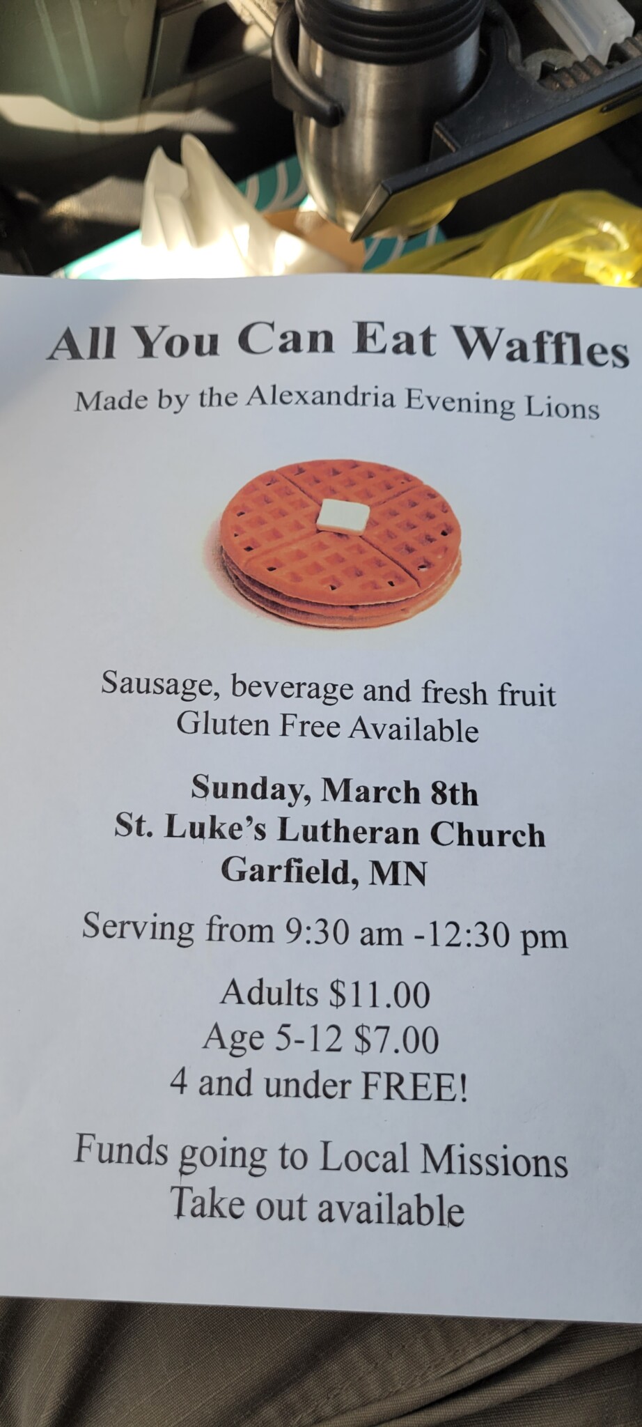 St. Lukes in Garfield MN Is holding a fund raiser for missions. All you can eat waffles . Serving from 9:30 am to 12:30 pm Adults $11.00 5-12 $7.00 4 and under free