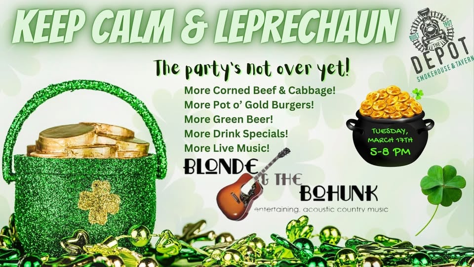 Keep Calm & Leprechaun The party’s not over yet! Join us Tuesday, March 17th from 5–8 PM for even more St. Paddy’s Day fun at the Depot. We’re keeping the good times rolling with corned beef & cabbage, Pot O’ Gold Burgers, green beer, and festive drink specials. Live music from Blonde & The Bohunk […] |