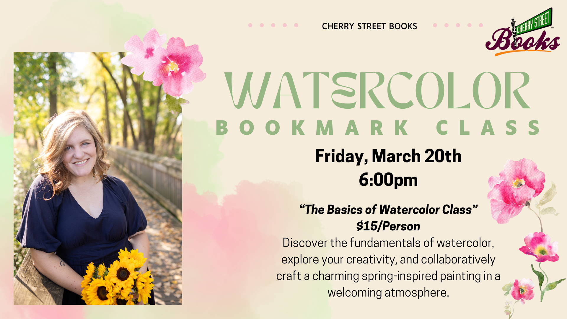 Join local artist Jenny Klukken for an inspiring watercolor painting class on Friday, March 20th at 6:00pm at Cherry Street Books. In this session, we'll explore essential supplies for beginners, paint mixing techniques, and brush skills. Together, we’ll create a charming spring-inspired watercolor bookmark. Feel free to bring your own brushes and paint, but don’t […] |