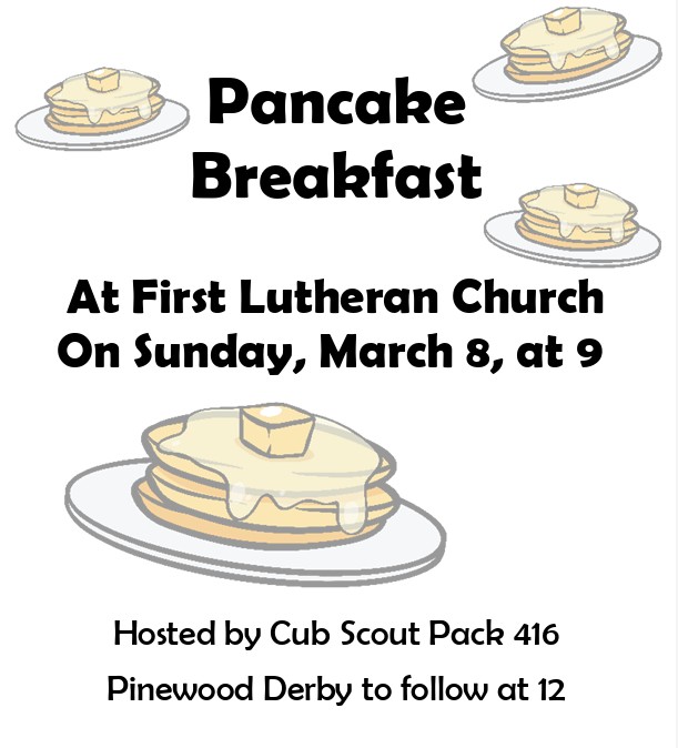 Come and help support the Cub Scouts at First Lutheran Church on Sunday, March 8, 2026 and enjoy some pancakes from 9-11 am. Stay and check out the Pinewood Derby which starts at Noon.