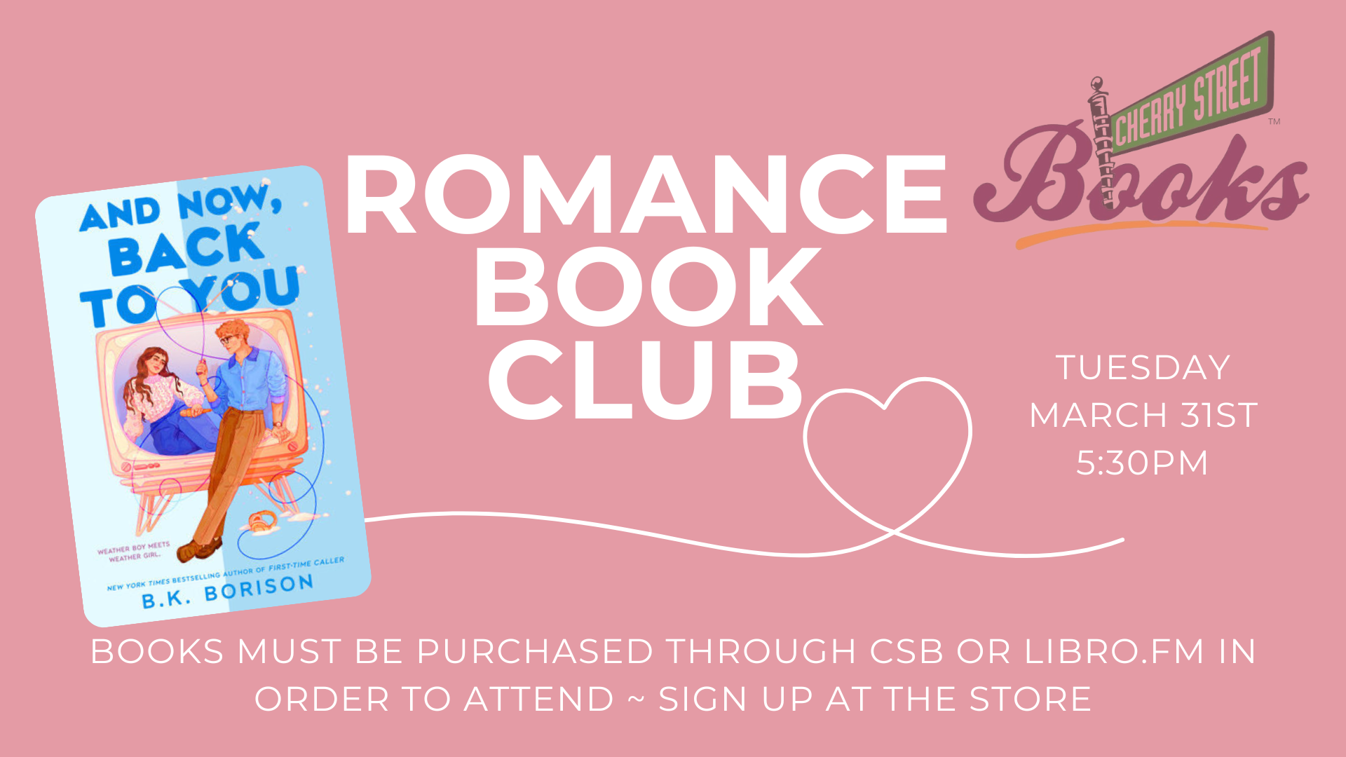 💞 Romance Book Club March Pick: And Now, Back to You by B.K. Borison 💞 📅 Date: Tuesday, March 31st 🕠 Time: 5:30pm 📍 Location: Cherry Street Books Books must be purchased through Cherry Street Books or Libro.fm in order to attend. Sign up in store to reserve your spot! Whether you’re a romance veteran […]